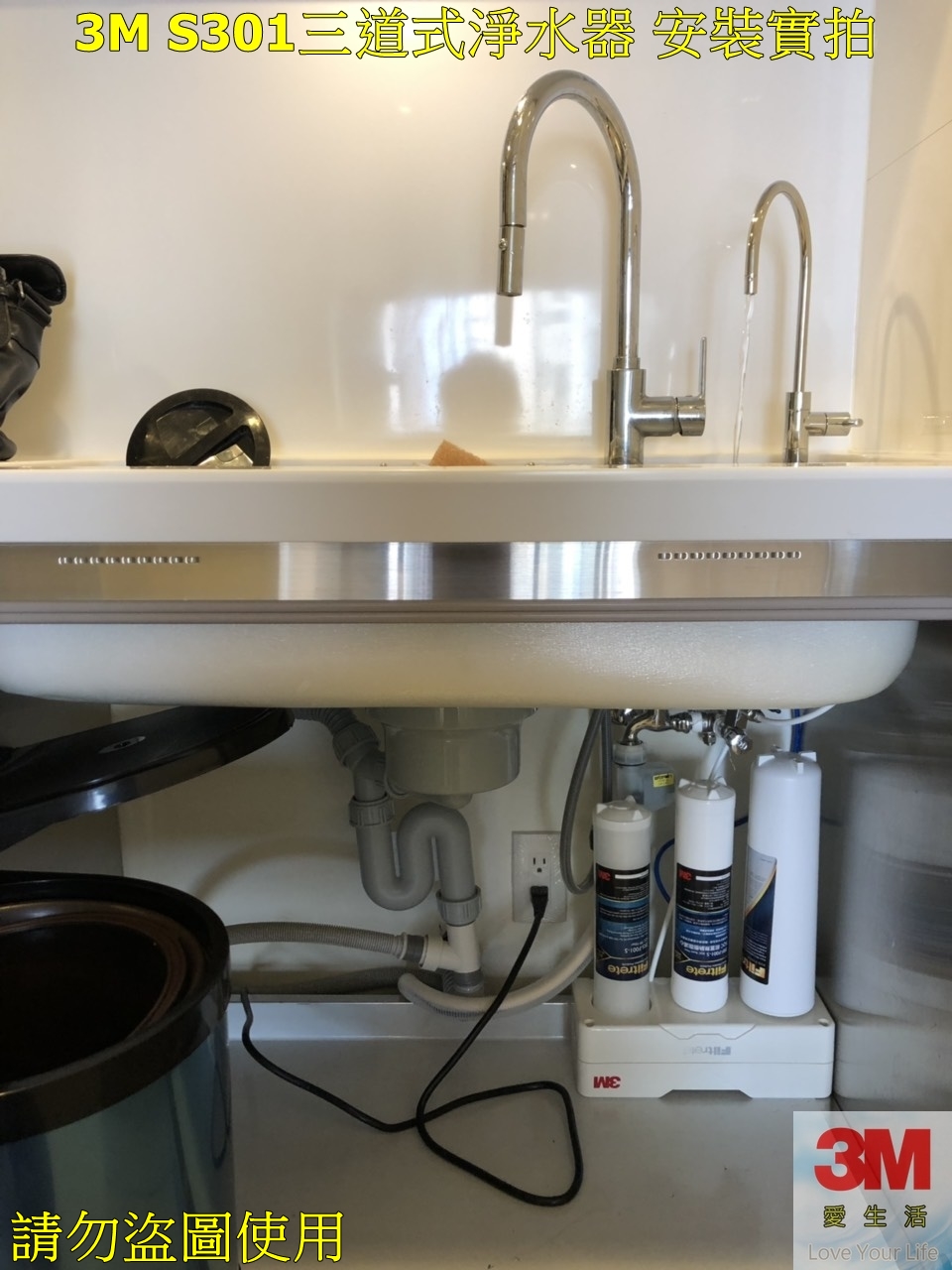 於是我就推薦她直接使用 S301三道是淨水器。S301 是 PP+軟水+S004淨水器的組合。優點是將原先的三個濾頭整合起來,而且可以用倒放的方式連螺絲固定都不需要,可以一次解決客戶的所有問題。